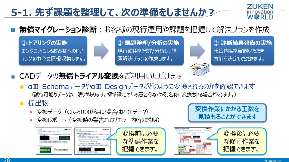 無償マイグレーション診断では、お客様の運用・課題をヒアリングし、課題解決プランの提案を行っています。無償トライアル変換では、CADVANCEのCADデータをCR-8000形式に変換した結果を確認することができます。変換時の警告やエラーなどをレポートとして提供しますので、移行時の手間や移行工数を把握いただくこともできます。