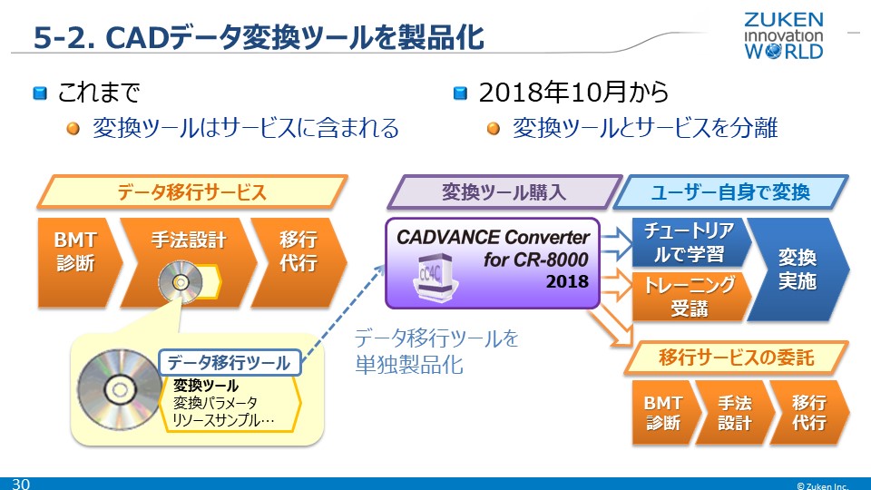 2018年10月、CR-8000 へのマイグレーションを実施されるお客様向けに、変換ツールの CADVANCE Converter for CR-8000 をリリースしました。これまで、CADVANCEからCR-8000へのデータ移行は、請負サービスとして提供しておりましたが、この変換ツールを購入いただくと、お客様ご自身でCADデータの移行ができます。チュートリアルによる学習や図研のトレーニングも受講いただくことができ、容易に操作方法を習得できます。この変換ツールは、CR-8000 のメジャーリビジョンアップにあわせて毎年バージョンアップする予定です。
