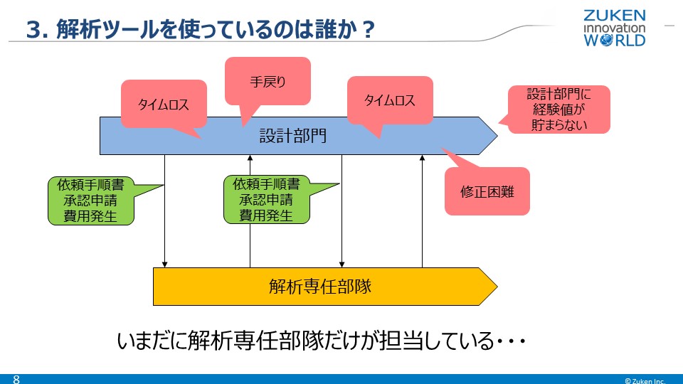 設計部隊と解析専任部隊とがサイロ化され、設計と解析のタスクが分断されてしまうことにより、本来の目的であるフロントローディングの効果も薄れてしまいます。解析技術者は設計データに存在するはずの情報を活用せずに、解析用の準備工程として重複して情報を構築し、一方で設計者は解析結果を受け取ってもそれをどのように設計修正に反映させるべきか、設計修正後の次の解析で収束するのかなどの指針もないまま設計を修正しなくてはならないという弊害が起きています。これら課題を解決し設計効率を向上するためには、設計者による解析検証のワークフローを確立することが急務となっています。