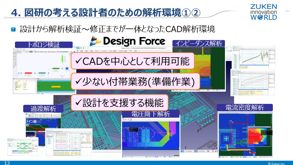 そのような状況において、図研が考える設計者のための解析環境は、設計から解析、検証、修正が一体となったCADシステムです。そのポイントは、設計者のホームグラウンドである基板CADが中心となること、付帯業務となる解析のための準備作業が少ないこと、そして解析結果を活かした設計を支援する機能を提供することです。