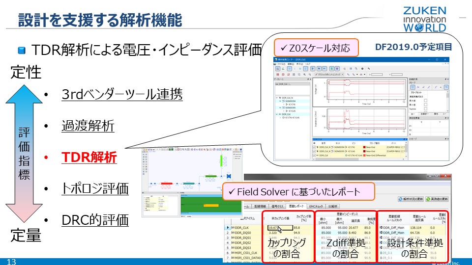 定量的な評価では、DRC的評価として、差動信号に対して平行配線のカップリングが成立している割合や差動インピーダンス目標に対する割合、設計ルールへの準拠の割合など、Field Solverに基づいた数値的なレポートを出力することができます。トロポジ評価では、配線情報から電気的情報を抜き出すことができます。