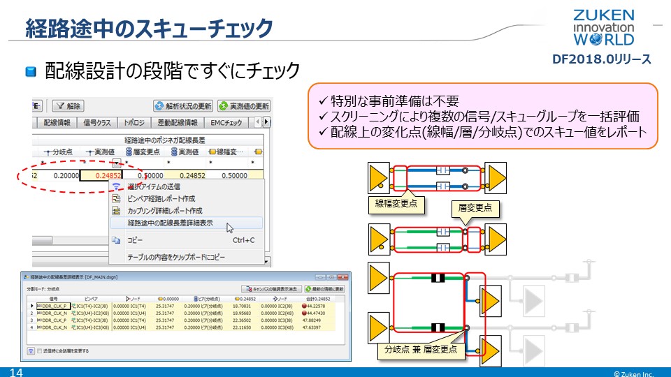 経路途中の差動スキューチェックでは、設計をスクリーニングして複数信号やスキューグループを評価し、配線上の変化点、例えば線幅が変わったところ、層が変わったところ、配線の分岐点などに着目してスキュー値をレポートします。