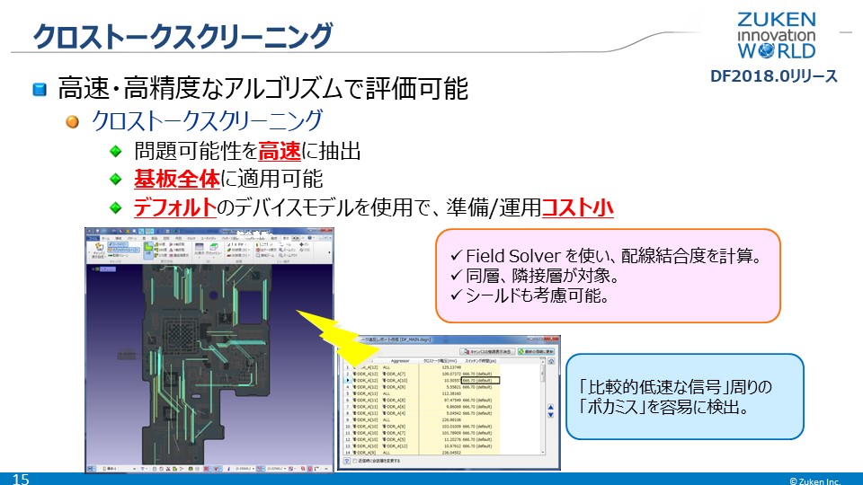 クロストークスクリーニングでは、並行配線が長いものを抽出するのではなく、Field Solverを実行してスクリーニングし、配線結合度を計算した上で危険箇所のアラートを出す機能を提供しています。