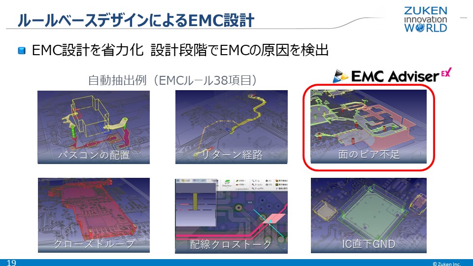 EMC検証では、設計しながらEMCの課題を未然に防止するために、ルールベースデザインの考え方を取り入れ、原理原則に基づき、知識のない設計者でも活用できる機能を EMC Adviser EX で提供しています。