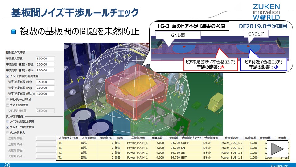EMC Adviser EX のルールのひとつに、ノイズ的に強い影響力を持つ部品の影響範囲を複数基板にまたがって考慮・チェックする機能があります。2019.0ではこのルールをさらに強化し、「面のビア不足」という干渉の影響を小さくするためにグラウンド面に充分なビアが打たれているかどうかも考慮するようになります。