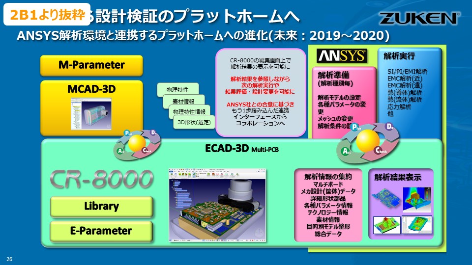 近年、エレキの世界でもシステム化3D化の解析検証ニーズが高まり、エレキCADとメカCAEとのシームレス連携が求められています。Design Force 側でメカCADの情報を取り込み、解析ツール側に渡すことで解析準備時間の大幅な短縮を図ることができます。将来的には、ホームグラウンドである基板CADのDesign Force の上に解析結果を描画して、解析設計者が使うことができる環境を提供しようとしています。