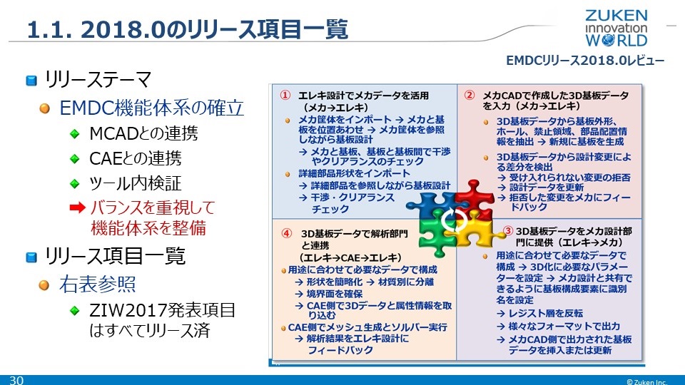 EMD Collaborator では、メカCADのデータを活用して電気設計に役立てる連携や、メカCADで作成した3D基板データを入力したり、逆に基板CADで作成した3D基板データをメカCADに出力するエレキとメカの連携、そして基板CADとCAE領域との連携というポートフォリオを描き、それに従った開発を進め、機能体系を整備してきました。