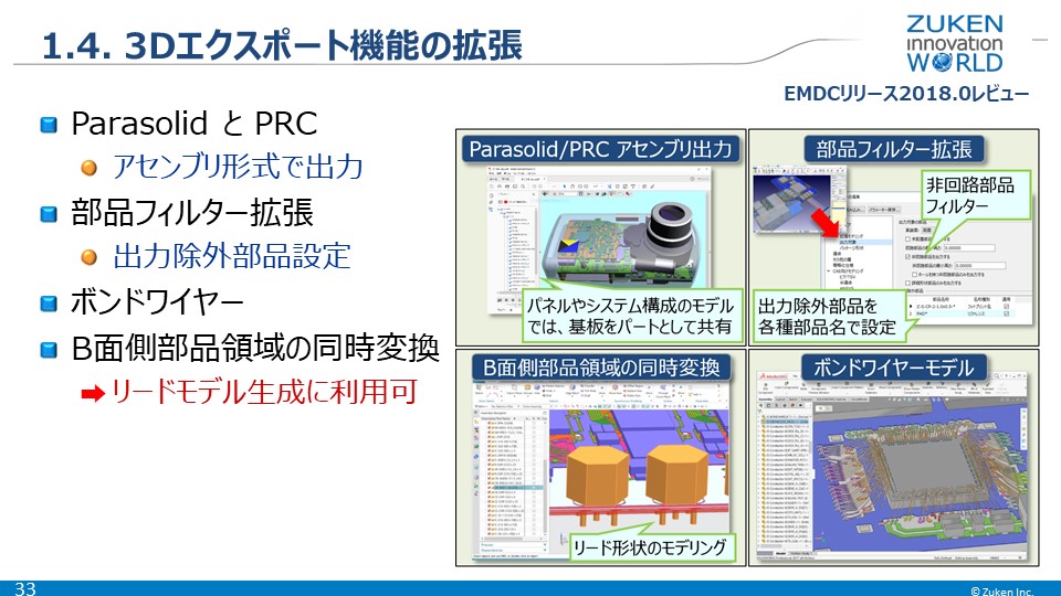 さらに3Dエクスポート機能の拡張として、ParasolidとPRCのフォーマットにおいてアセンブリ形式での出力に対応した他、部品フィルター設定の拡張、ボンドワイヤーのモデルの生成、B面部品領域から基板の裏側の形状を同時に生成する機能を追加しています。