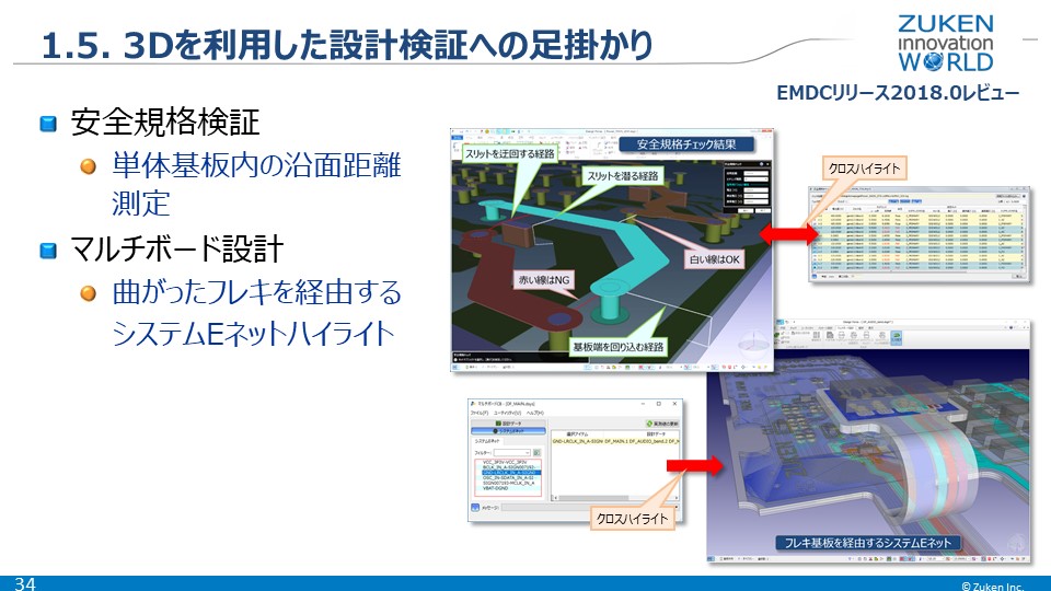 3Dを利用した設計検証の足掛かりとしては、単体基板内の沿面距離を測定しクリアランスルール違反を検出する安全規格検証対応を行っております。さらに、フレキシブル基板を含むマルチボード設計において、システムEネットをグラフィックス表示する機能も追加しています。