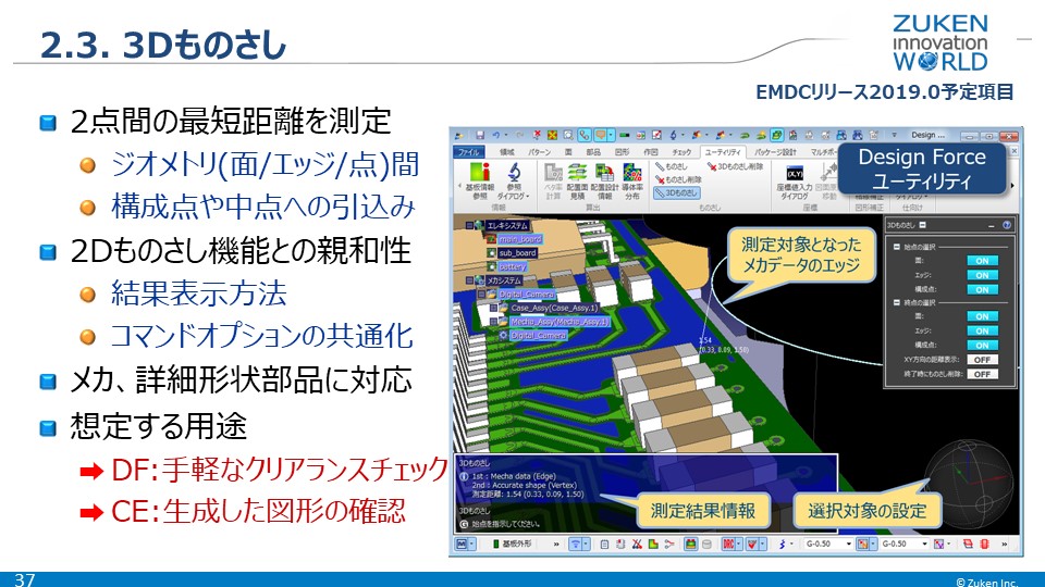 2019.0リリースでも2018.0と同じエレメカ協調設計のポートフォリオに沿った機能追加や、対応するメカCADのバージョンアップを行う他、お客様から要望が多い機能を追加する予定です。その1つが3Dものさしです。