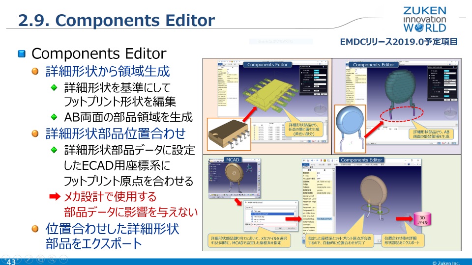もう1つの詳細形状部品の位置合わせでは、メカCAD内のローカルな座標系を、エレキ側のフットプリントの原点に合わせる機能を追加します。こちらは、2Dモデルと3Dモデルを統合した部品ライブラリ環境を目指す上で最善で、かつお客様からの要望が多かった機能です。位置合わせ後の詳細部品モデルを3Dにエクスポートすることで、エレキ設計における3Dモデルを整備するツールとしても活用いただけます。