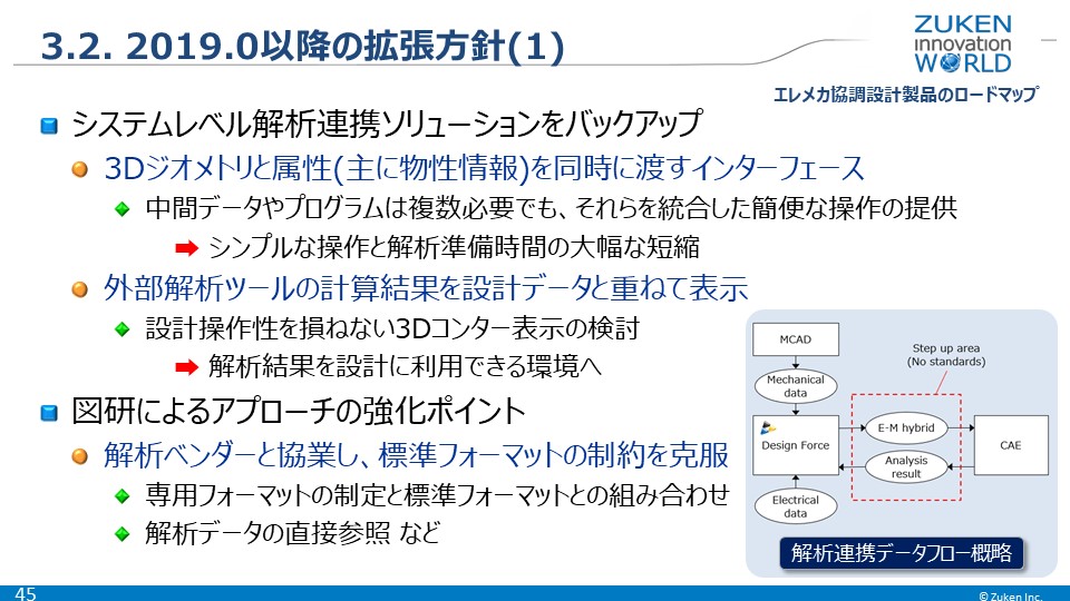 大きな方針は、システムレベル解析の連携ソリューションをバックアップすることです。設計者のホームグラウンドである Design Force で設計した情報にメカCAD情報を加えてハイブリッドのデータモデルとし、これをCAE解析環境に渡します。そして解析結果の情報を Design Force 側にフィードバックし、設計データと重ねて表示するという双方向連携を目指しています。現状、双方向連携のための標準フォーマットがないため、解析ベンダーとの協業を一層強化して専用フォーマット制定や解析データに直接アクセスするようなアプローチも視野に開発を進めてまいります。