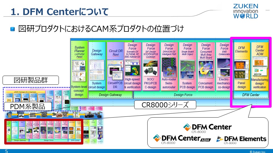 DFM Centerは、CR-8000シリーズにおける構想設計から回路設計、基板設計の工程に続く製造設計/DFM検証環境のCAMとして位置付けられています。図研では、DFM Center 以外にも、DFM Elements 、DFM Center /ADM の3つのCAM製品を提供しています。