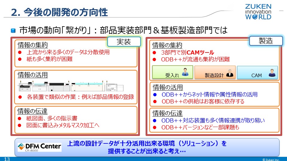 近年のIoT、スマートファクトリー、生産拠点フリー、FABレスの市場動向を背景に、情報の集約、活用、伝達の要求が高まっています。同様に各装置メーカーからDFM Center に対して、上流にあるCADが持つ情報を集約し、それを元に情報を活用し、さらなる下流へと伝達したいという要求があがっており、かつ上流のCADには依存しないということも重要な要件になっています。図研はこのような新たなCAMニーズに真摯に向き合い開発を進めています。