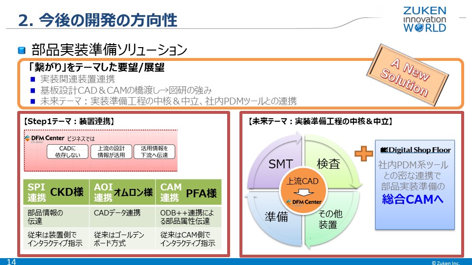 部品実装ソリューションでは、実装関連装置との連携を図るべく、CKD様、オムロン様、PFA様と連携を進めています。今後は、このような輪を広げ、図研の強みでもある基板設計CADとCAM間の橋渡し役を担っていきたいと考えています。また、実装系のPDMソリューションDigital Shop Floor と連携し、部品実装準備の統合CAMを目指したいと考えています。