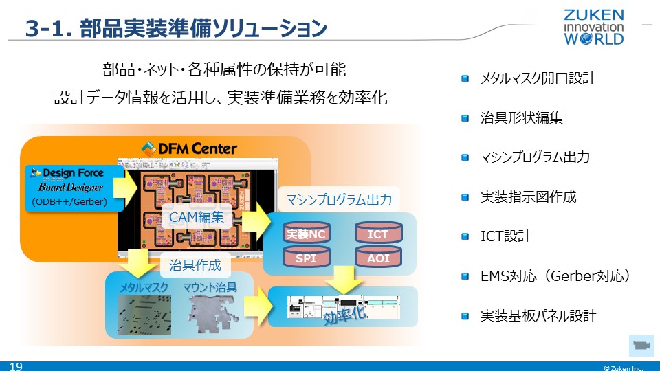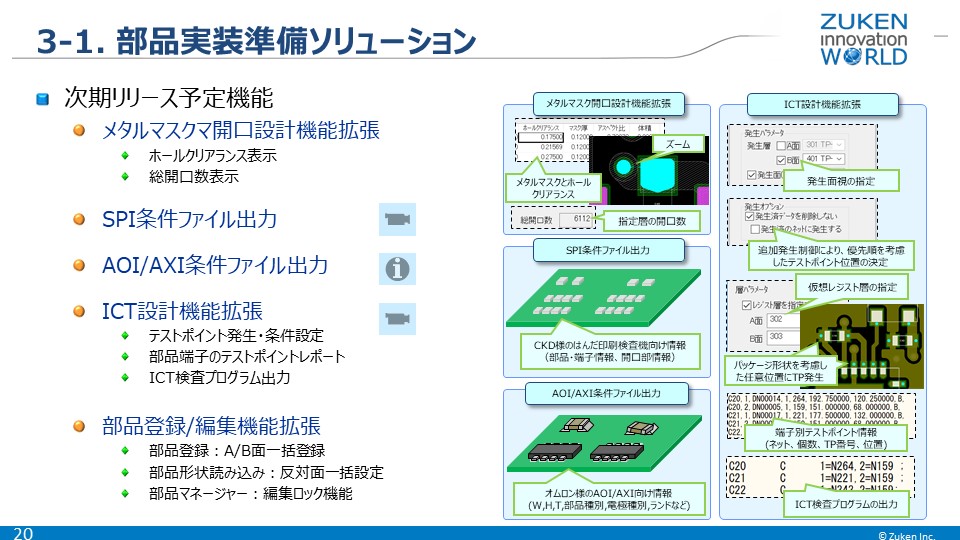 DFM Center 2019.0 の部品実装準備ソリューションでは、メタルマスク開口設計の機能拡張を行い、メタルマスクとホールのクリアランスを表示したり、指定層の総開口数表示が行えるようにします。またCKD様向けのSPI条件ファイル出力、オムロン様向けのAOI/AXI条件ファイル出力に対応するほか、ICT設計機能の拡張や部品登録、関連編集機能などの拡張を予定しています。