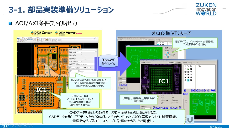 AOI/AXI条件ファイル出力機能としては、DFM Center または DFM Viewer Advance から部品ボディ、ピン形状、部品属性をオムロン様のVTシリーズに渡せるようにします。これにより部品登録作業を簡易化することができます。