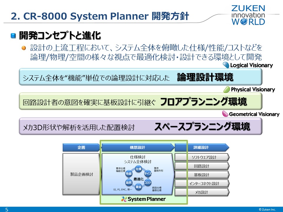 System Plannerは、CR-8000の中でもより上流の工程においてシステム全体を俯瞰し、仕様、性能、コストなどを論理/物理/空間の様々な視点で、最適化検討・設計できる環境として開発しています。その実現のために論理視点のLogical Visionary 、物理視点のPhysical Visionary、空間視点のGeometrical Visionary の各ツールを提供しています。