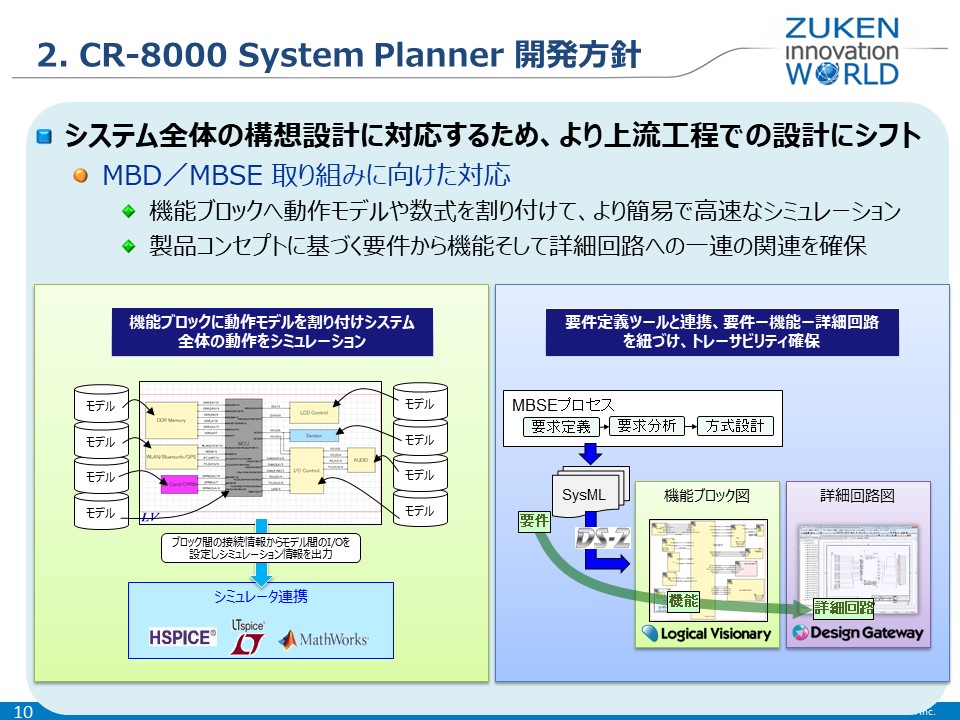 MBD(モデルベース設計)やMBSE(モデルベースシステムズエンジニアリング)に対応し、機能ブロックに対して動作モデルや数式を割り付け、より簡易で高速なシミュレーションや分析をできるようにします。また製品コンセプトに基づく要件から機能、詳細回路への一連のトレーサビリティを確保しながら要件分析ができる環境を目指します。