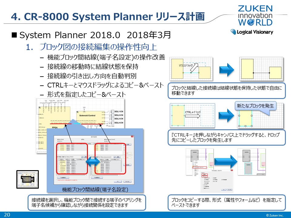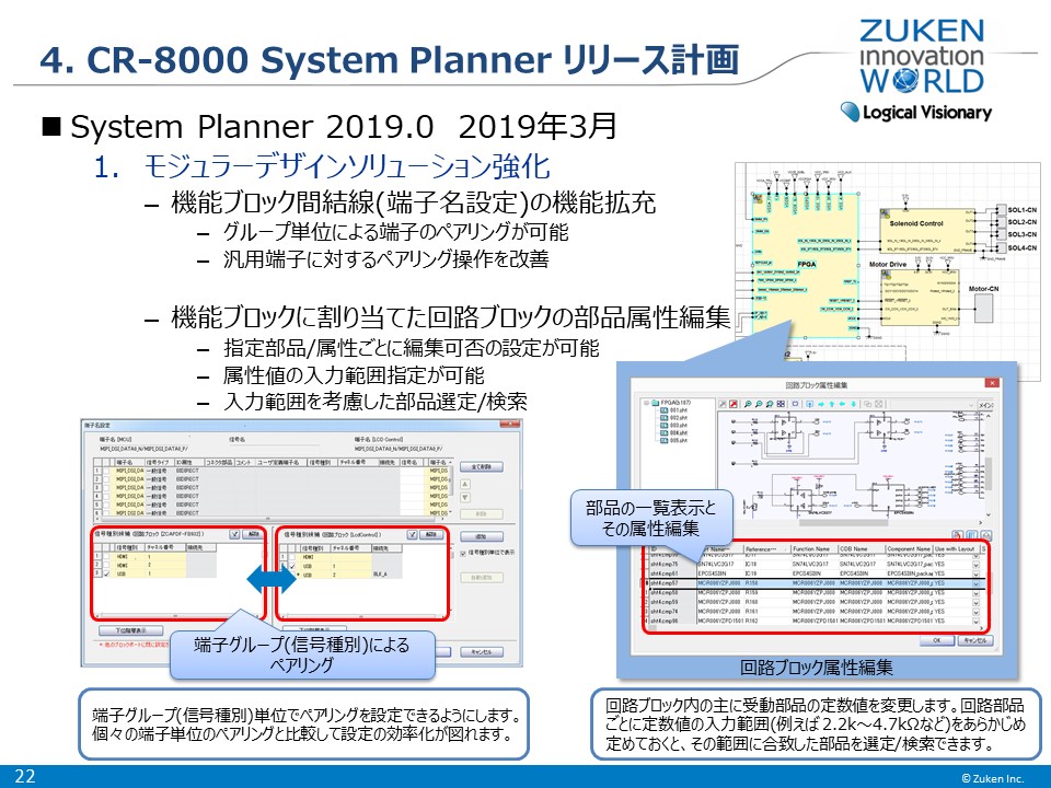 2019年3月にリリースする2019.0では、Logical Visionary でモジュラーデザインに対するソリューションをさらに強化し、機能ブロック間結線の機能拡充と機能ブロックに割り当てた回路ブロックの部品属性編集の機能を提供します。