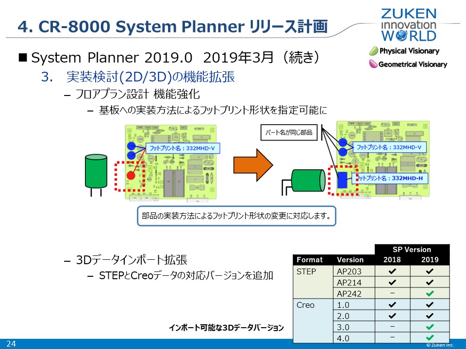 2019.0のPhysical Visionary では、2D/3Dの実装検討における機能を拡張し、フロアプラン設計での機能強化を図ります。より精度の高いフロアプランを行うために、基板への実装方法によって異なるフットプリント形状を指定できるようにする予定です。また、Geometrical Visionary では 3Dデータインポートの拡張とし、STEPとCreoデータの対応バージョンの追加を予定しています。